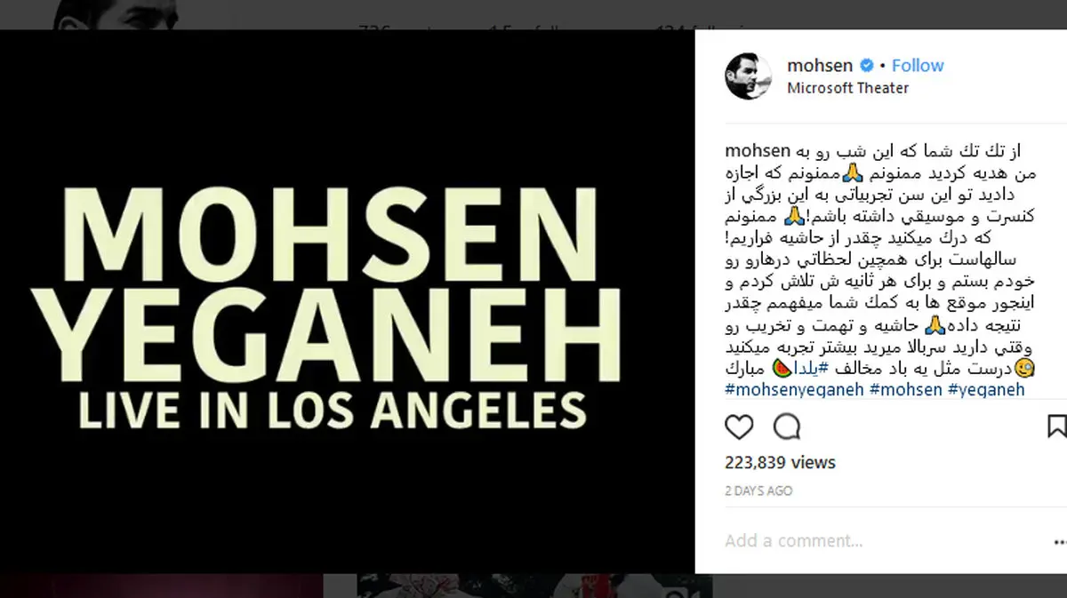 رکنا: محسن یگانه با به اشتراک گذاشتن متنی در اینستاگرام به حواشی که برای کنسرتاش در لس آنجلس پیش آمد، واکنش نشان داد.