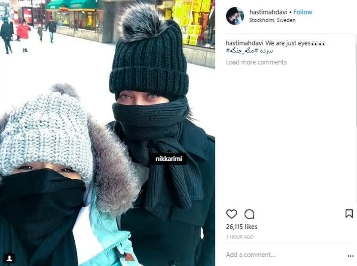 رکنا: هستی مهدوی فر با انتشار یک سلفی به همراه نیکی کریمی از سرمای وحشتناک سوئد نوشت.