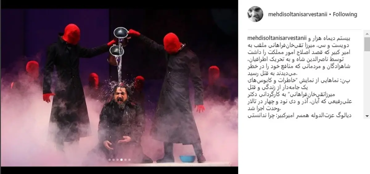 مهدی سلطانی بازیگر Actor سریال شهرزاد که در نمایش خاطرات و کابوس‌های یک جامه‌دار از زندگی و قتل Murder میرزا‌تقی‌خان‌فراهانی ایفاگر نقش امیرکبیر بود. تصاویری از این نمایش را در اینستاگرام Instagram منتشر کرد.