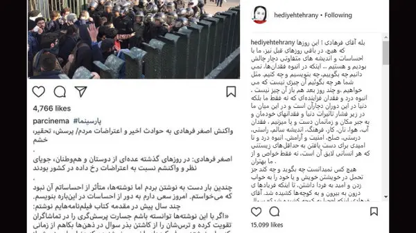 هدیه تهرانی با انتشار متنی در اینستاگرام، به یادداشت اصغر فرهادی Asghar Farhadi درباره اعتراضات اخیر کشور واکنش نشان داد و نوشت: