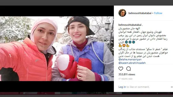 بهنوش طباطبایی فیلمی از تمرین ووشو خود با الهه منصوریان (عضو تیم ملی ووشو بانوان و قهرمان جهان) را در اینستاگرام Instagram منتشر کرد و در وضیح آن نوشت: