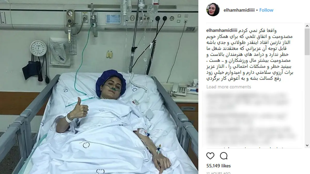 الهام حمیدی، بازیگر Actor سینما Cinema و تلویزیون با انتشار عکسی از الناز شاکردوست روی تخت بیمارستان در صفحه اینستاگرامش نوشت: «واقعا فکر نمیکردم مصدومیت و اتفاق تلخی که برای همکار خوبم الناز نازنین افتاد اینقدر طولانی و جدی باشه. قابل توجه آن عزیزانی که معتقدند شغل ما خطر ندارد و درآمدهای هنرمندان بالاست و مصدومیت بیشتر مال ورزشکاران و ... هست، ببینید خطر و مشکلات احتمالی را، الناز عزیز برات آرزوی سلامتی دارم و امیدوارم خیلی زود رفع کسالت بشه و به آغوش کار برگردی...»