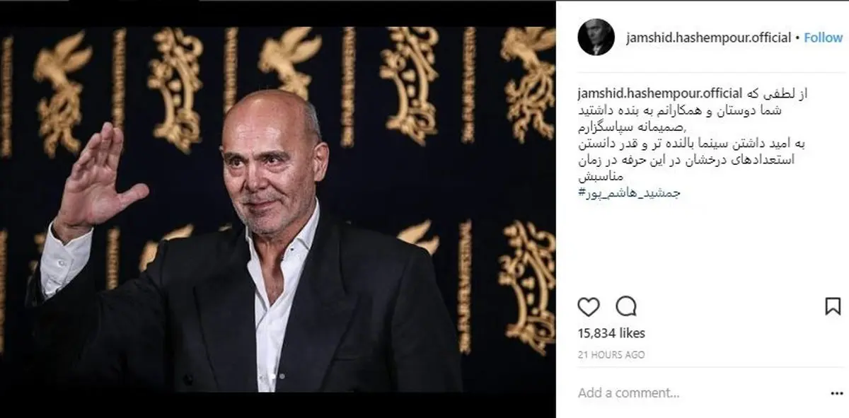 جمشید هاشمپور در اینستاگرام Instagram نوشت: از لطفی که شما دوستان و همکارانم به بنده داشتید صمیمانه سپاسگزارم. به امید داشتن سینما Cinema بالنده تر و قدر دانستن استعدادهای درخشان در این حرفه در زمان مناسبش.