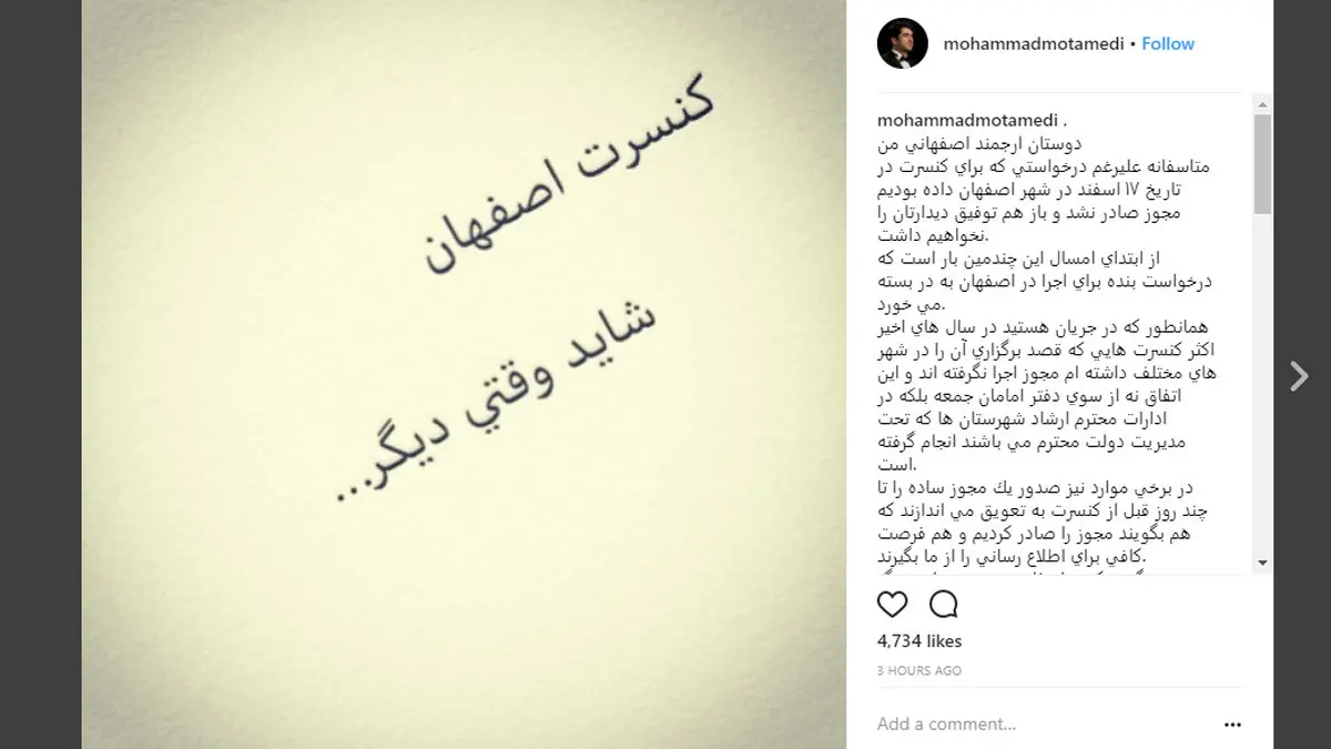معتمدی ضمن ارایه این گفتگو، متنی را در اینستاگرام Instagram خود منتشر کرده که در مشروح آن آمده است: «دوستان ارجمند اصفهانی! متاسفانه علیرغم درخواستی که برای کنسرت در تاریخ ١٧ اسفند در شهر اصفهان داده بودیم مجوز صادر نشد و باز هم توفیق دیدارتان را نخواهیم داشت. از ابتدای امسال این چندمین بار است که درخواست بنده برای اجرا در اصفهان به در بسته می خورد.