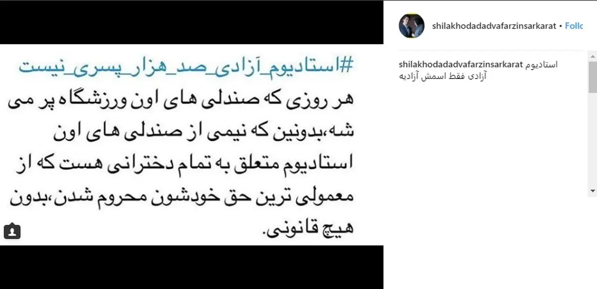 شیلا خداداد متنی را در اینستاگرام Instagram به اشتراک گذاشت و به کنایه نوشت: «استادیوم آزادی Freedom فقط اسمش آزادی است.»برای ورود به کانال تلگرام ما کلیک کنید.