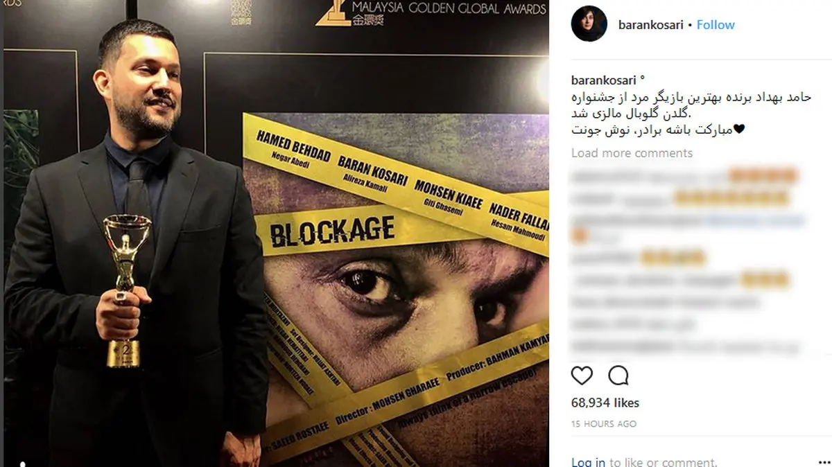 باران کوثری با انتشار عکسی از حامد بهداد در جشنواره گلدن گلوبال مالزی، در اینستاگرام Instagram نوشت: