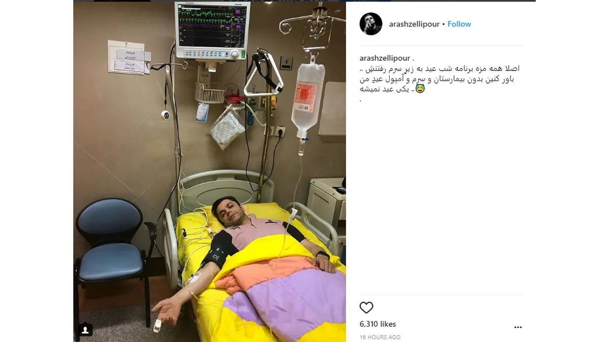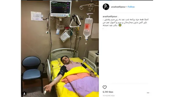 رکنا: آرش ظلی پور عکسی از خودش در بیمارستان و زیر سرم در اینستاگرام خود منتشر کرد.