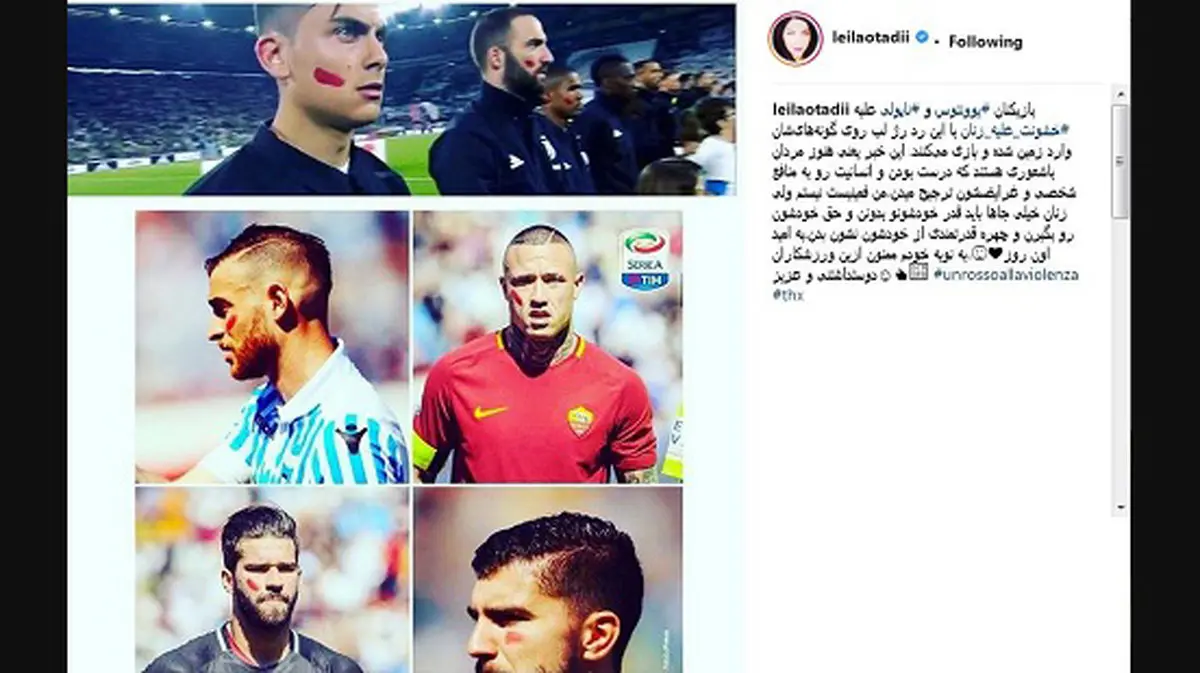 رکنا: لیلا اوتادی بازیگر معروف با انتشار تصویر صورت های رژآلود بازیکنان یوونتوس و ناپولی در صفحه اینستاگرام خود نسبت به حرکت نمادین این بازیکنان برای خشونت علیه زنان واکنش نشان داد.