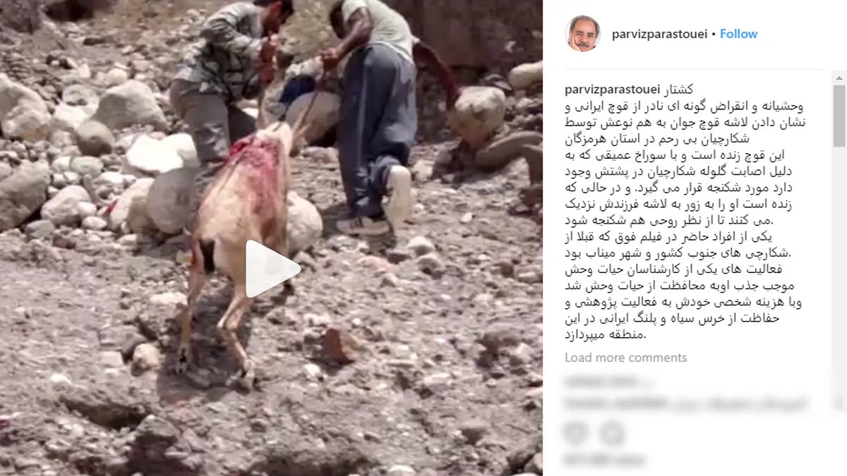 «احتراماً به اطلاع عموم میرساند فیلمی در خصوص شکار غیرمجاز دو رأس حیوان وحشی در استان هرمزگان در فضای مجازی (اینستاگرام ) توسط هنرمند Artist کشورمان پرویزپرستویی منتشر شده است.