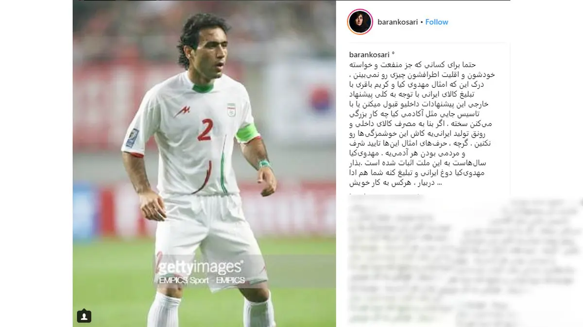 وی در این پست نوشت: حتما برای کسانی که جز منفعت خود. اقلیت اطرافشون چیزی رو نمی بینن درک اینکه امثال مهدوی کیا و باقری با تبلیغ کالای ایرانی با توجه به کلی پیشنهاد خارجی یا با تاسیس آکادمی کیا برای پرورش فوتبالیست های با استعداد ایرانی، چه خدمت بزرگی به کشورشن می کنن؛ خیلی کار دشواری است!