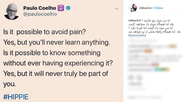 رکنا: نیکی کریمی با انتشار متنی از پائولو کوئیلو اینستاگرام خود را به روز کرد.