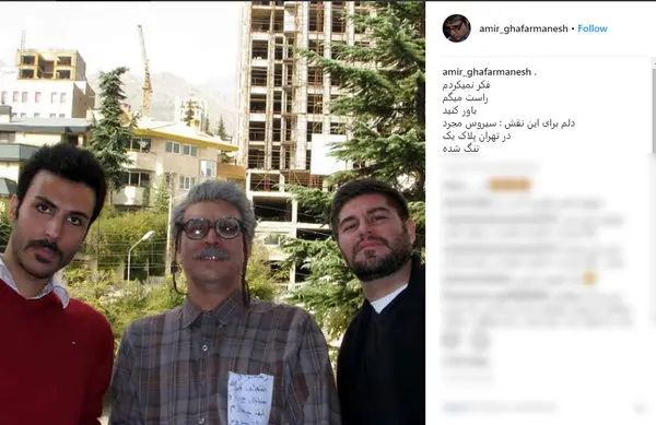 امیر غفارمنش با انتشار این عکس در اینستاگرامش نوشت: فکر نمیکردم راست میگم باور کنید دلم برای این نقش: سیروس مجرد در تهران پلاک یک تنگ شده.