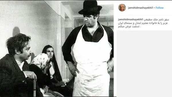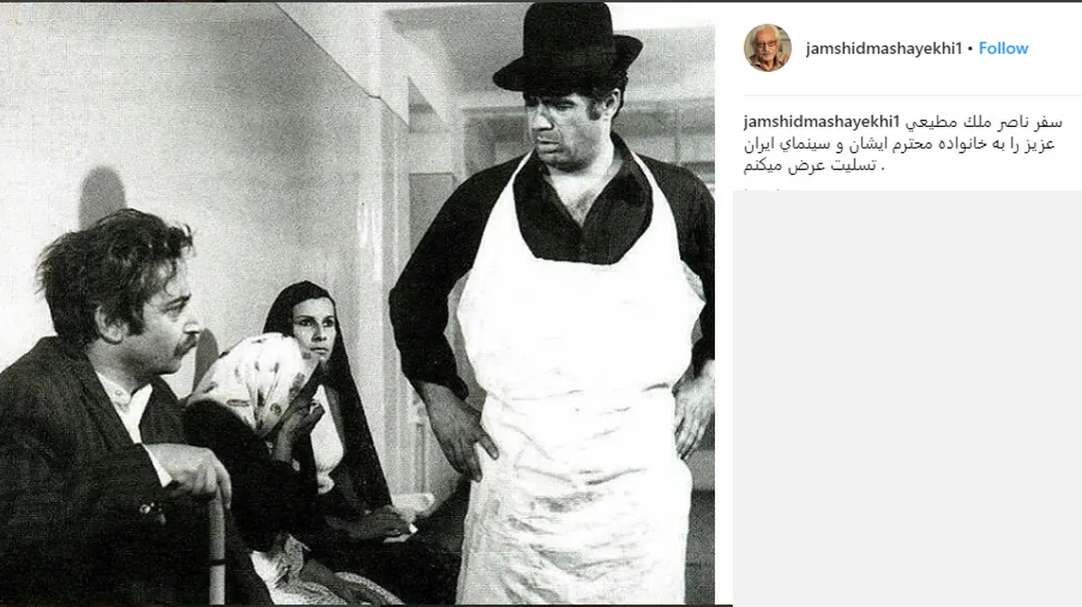 جمشید مشایخی با انتشار این عکس در اینستاگرامش نوشت: سفر ناصر ملک مطیعی عزیز را به خانواده محترم ایشان و سینمای ایران تسلیت عرض میکنم.