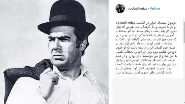 پولاد کیمیایی با انتشار این عکس در اینستاگرامش نوشت: فرمون سینمای ایران درگذشت و باز با حسرت و دل گرفتگی مثل فردین که برای مجوز کار باید پشت درهای بسته منتظر میماند.... آخرین بار هم با دلشکستگی در تلویزیون ملی که همه چیز نام دارد جز ملی کارنامه او را انکار و برنامه را قطع کردند ...به یاد دارم قرار بود در فیلم آخرم افتخار این را داشته باشم که او جلوی دوربین فیلمم برود ولی در آخرین لحظات تلفنی به من شد و از من خواستند تا از بودن او در فیلم صرف نظر کنم هر چه تلاش کردیم تا او را جلوی دوربین بیاریم نشد که برای همه ما باعث تأسف بود ...شما را نمیشود انکار کرد روحش شاد و یادت گرامی اولین سوپر استار سینمای ایران