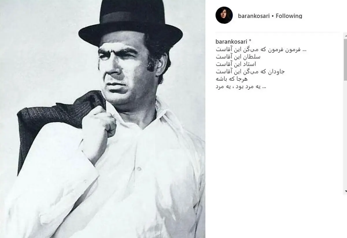باران کوثری هم از جایگاه ملک مطیعی نوشت: «فرمون فرمون که میگن این آقاست... سلطان این آقاست، استاد این آقاست جاودان که میگن این آقاست. هرجا که باشه، یه مرد بود، یه مرد ...»