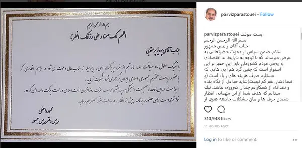 پرویز پرستویی با انتشار این عکس در صفحه اش نوشت:
