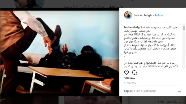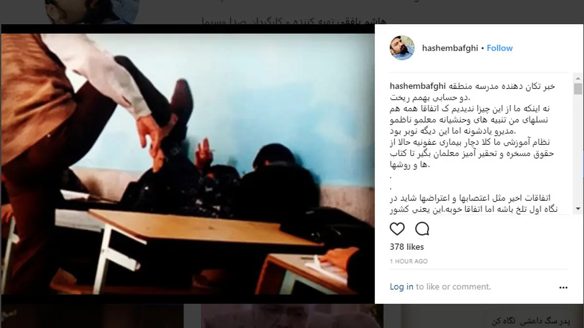 هاشم بافقی با انتشار این عکس در اینستاگرامش نوشت: خبر تکان دهنده مدرسه منطقه دو حسابی بهمم ریخت. نه اینکه ما از این چیزا ندیدیم ک اتفاقا همه هم نسل های من تنبیه های وحشیانه معلم و ناظم و مدیر و یادشونه اما این دیگه نوبر بود.