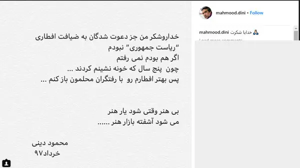 محمود دینی در اینستاگرامش نوشت: خدا رو شکر من جز دعوت شدگان به ضیافت افطاری رییس جمهور نبودم، اگر هم بودم نمیرفتم چون پنج سال که خونه نشینم کردند... پس بهتر افطارم رو با رفتگاران محلمون باز کنم. بیهنر وقتی شود یار هنر Art می شود آشفته بازار Store هنر.