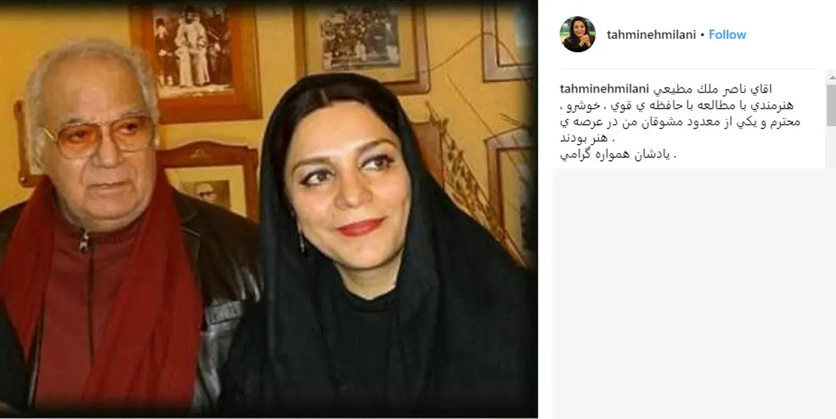 تهمینه میلانی با انتشار این عکس در اینستاگرامش نوشت: آقای ناصر ملک مطیعی هنرمندی با مطالعه با حافظه ی قوی، خوشرو، محترم و یکی از معدود مشوقان من در عرصه ی هنر Art بودند. یادشان همواره گرامی.