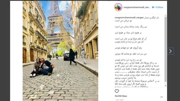 رکنا: نرگس محمدی عکسی به همراه همسرش در شهر پاریس منتشر کرد.