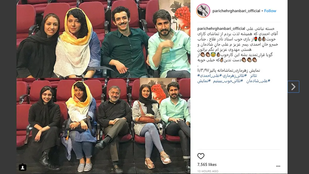پریچهر قنبری با انتشار این عکس در اینستاگرامش نوشت: خسته نباشى على آقاى احمدى که همیشه لذت بردم از تماشاى کاراى خوبت از بازى خوب استاد نادر فلاح، جناب خسرو خانِ احمدى، پسر عزیز م على جانِ شادمان و هستى مهدوى عزیز ام نگم براتون گویا قرار ِتمدید بشه این کارخوب از دست ندین که خیلى خوبه...