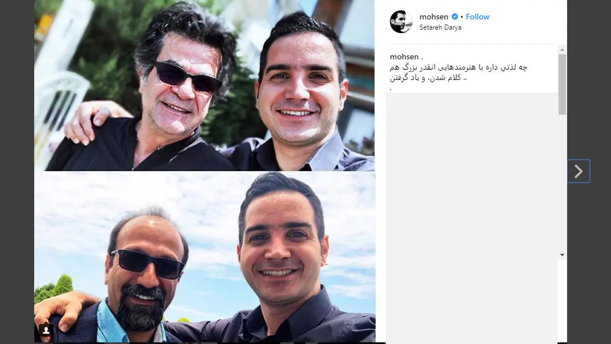 محسن یگانه با انتشار این عکس در اینستاگرامش نوشت: چه لذتی داره با هنرمندهایی انقدر بزرگ هم کلام شدن، و یاد گرفتن..