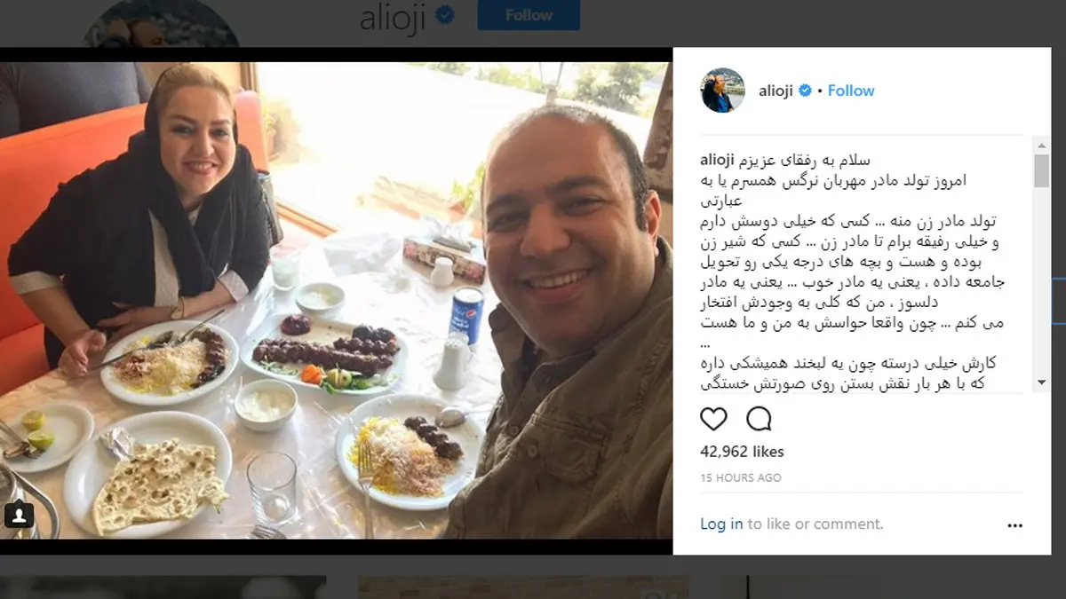 علی اوجی با انتشار این عکس در اینستاگرامش نوشت: سلام به رفقاى عزیزم امروز تولد مادر مهربان نرگس همسرم یا به عبارتى تولد مادر زن منه... کسى که خیلى دوسش دارم و خیلى رفیقه برام تا مادر زن... کسى که شیر زن بوده و هست و بچههاى درجه یکى رو تحویل جامعه داده، یعنى یه مادر خوب... یعنى یه مادر دلسوز ، من که کلى به وجودش افتخار مى کنم... چون واقعا حواسش به من و ما هست... کارش خیلى درسته چون یه لبخند همیشکى داره که با هر بار نقش بستن روى صورتش خستگى کار و بدى هاى زندگى از تنت در مى ره... سایت مستدام مادر زن جانِ خودم... همیشه برام قرمه سبزى و باقالى پلو و زرشک پلوى خوشمزه بپز دوستت دارم.