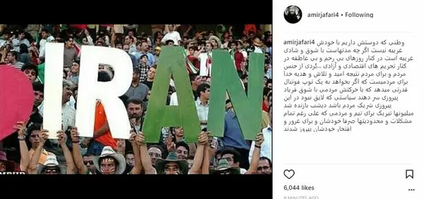 امیر جعفری با انتشار تصویری از هوداران تیم ملی فوتبال ایران در اینستاگرام Instagram نوشت: «وطنی که دوستش داریم با خودش غریبه نیست اگر چه مدتهاست با شوق و شادی غریبه است در کنار روزهای بیرحم و بیعاطفه در کنار تحریمهای اقتصادی و آزادی Freedom ...بُردی از جنس مردم و برای مردم نتیجه امید و تلاش و هدیه خدا برای مردمیست که اگر بخواهد به یک توپ فوتبال قدرتی میدهد که با حرکتش مردمی با شوق فریاد پیروزی سر دهند سیاستی که لایق نبود در این پیروزی شریک مردم باشد دیشب بازنده شد.