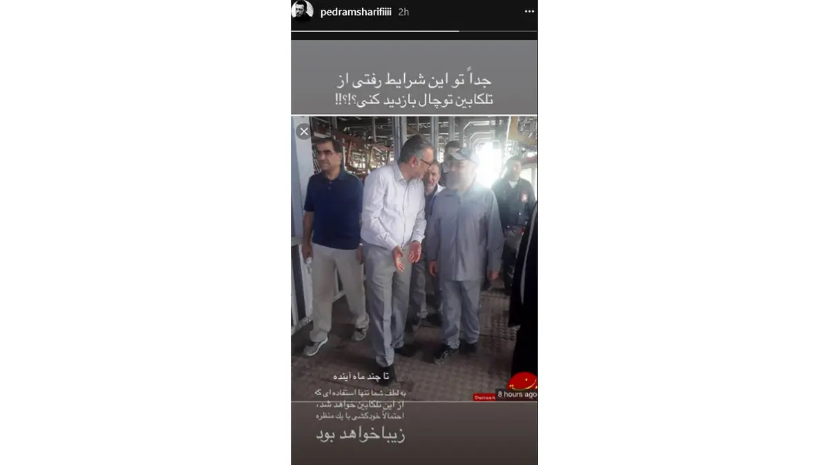پدرام شریفی با انتشار عکس دوم در اینستاگرامش نوشت: جدا تو این شرایط رفتی از تله کابین توچال بازدید کنی؟! تا چند ماه آینده به لطف شما تنها استفاده ای که از این تله کابین خواهد شد، احتمالا خودکشی با یک منظره زیبا خواهد.