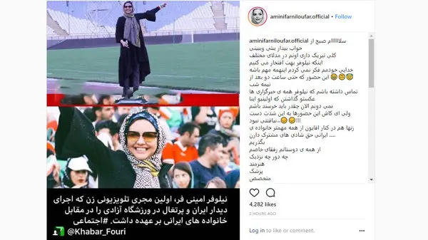 نیلوفر امینیفر با انتشار عکس دوم در اینستاگرامش نوشت: سلاااااام صبح از خواب بیدار بشی وببینی کلی تبریک داری اونم در مدلای مختلف اینکه نیلوفر بهت افتخار می کنیم خدایی خودمم فکر نمی کردم اینهمه مهم باش. این حضور که حتی ساعت دو بعد از نیمه شب تماس داشته باشم که نیلوفر همه ی خبرگزاری ها عکستو گذاشتن که اولینیو اینا نمی دونم الان چقدر باید خرسند باشم ولی ای کاش این حضورها به این شدت دست نیافتنی نبود....!!! زنها هم در کنار اقایون از همه مهمتر خانواده ی ایرانی حق شادی های مشترک دارن..... بگذریم از همه ی دوستانم رفقای خاصم چه دور چه نزدیک هنرمند Artist پزشک متخصص