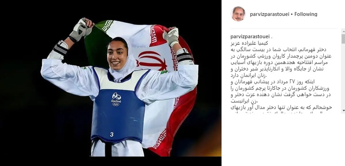 پرویز پرستویی با انتشار تصویری از کیمیا علیزاده اولین بانوی ورزشکار ایرانی که موفق به کسب مدال المپیک شده است، نوشت: «کیمیا علیزاده عزیز دختر قهرمانم، انتخاب شما در بیست سالگى به عنوان دومین پرچمدار کاروان ورزشى کشورمان در مراسم افتتاحیه هجدهمین دوره بازیهاى آسیایى نشان از جایگاه والا و انکارناپذیر شیر دختران و زنان ایرانمان دارد.