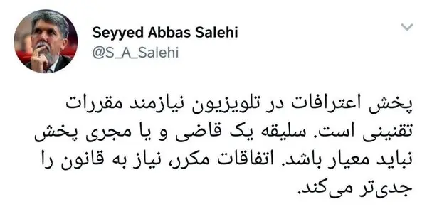 سیدعباس صالحی وزیر فرهنگ و ارشاد اسلامی در توییتی درباره پخش اعترافات یکی از فعالان شبکه مجازی اینستاگرام Instagram نوشت: پخش اعترافات در تلویزیون نیازمند مقررات تقنینی است. سلیقه یک قاضی Judge و یا مجری پخش نباید معیار باشد. اتفاقات مکرر، نیاز به قانون Law را جدیتر میکند.