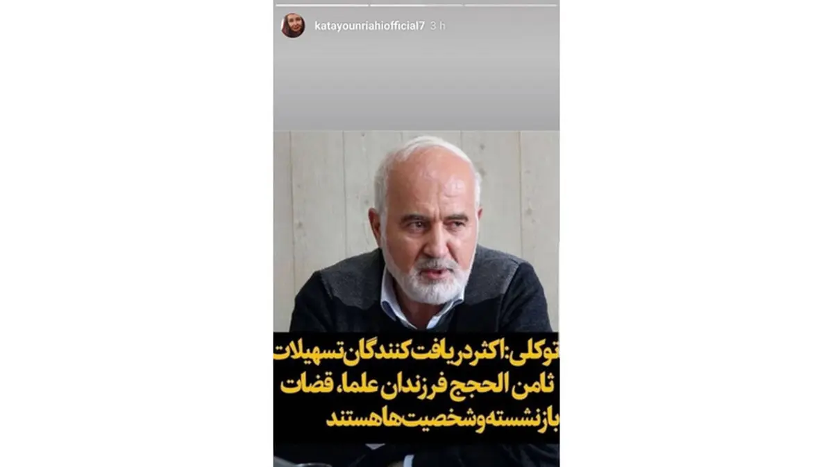 رکنا: کتایون ریاحی با انتشار استوری به حرف توکلی درباره ثامن الحجج استناد کرد و واکن نشان داد.