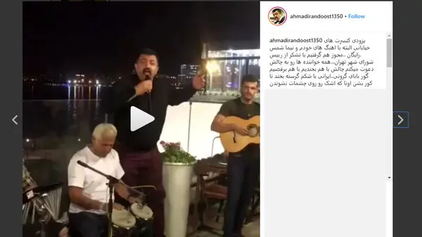 احمد ایراندوست با انتشار این ویدئو نوشت: بزودی کنسرت های خیابانی البته با اهنگ های خودم و نیما شمس. رایگان.. مجوز هم گرفتیم با تشکر از رییس شورای شهر تهران... همه خواننده ها رو به چالش دعوت میکنم چالش با هم بخندیم با هم برقصیم گور بابای گرونی.. ایرانی با شکم گرسنه بخند تا کور بشن اونا که اشک رو روی چشمات نشوندن.