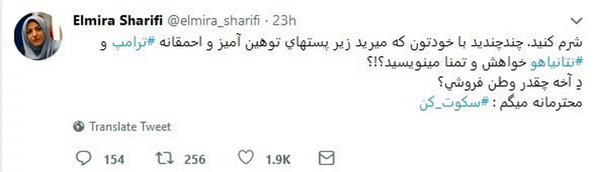 رکنا: المیرا شریفی، مجری و گوینده شبکه خبر از رفتار برخی کاربران شبکه های اجتماعی در قبال ترامپ و نتانیاهو انتقاد کرد.