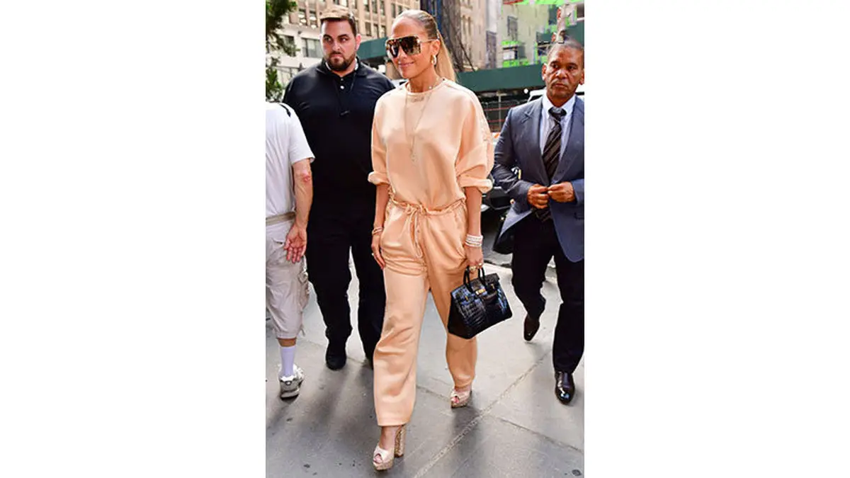 رکنا:جنیفر لوپز با لباس سرهمی هلویی رنگ و کیف دستی مشکی و عینک بیش از حد بزرگ خود در حال قدم زدن در نیویورک این عکس را گرفته و منتشر کرده است.