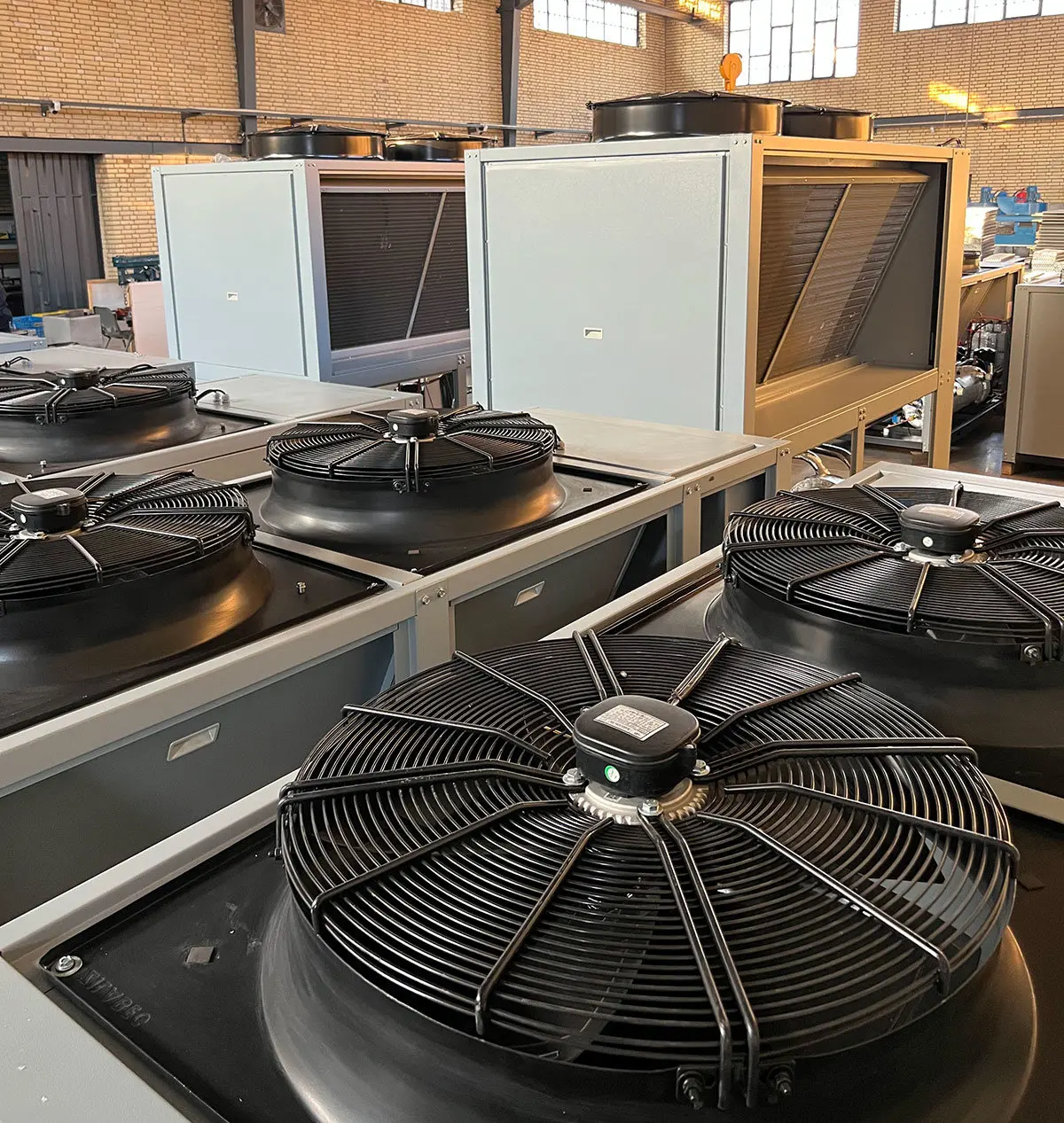 چیلر هوا خنک، یکی از انواع سیستمهای چیلر، به کمک هوای محیط به کاهش دمای آب درون سیستم میپردازد. در این سیستم، هوا بهعنوان عامل خنککننده عمل میکند و نیازی به آب خنککننده از برجهای خنککننده نیست. این ویژگی باعث میشود که چیلرهای هوا خنک برای مناطقی با کمبود منابع آب یا در شرایطی که استفاده از برجهای خنککننده دشوار است، انتخاب مناسبی باشند. از سوی دیگر، فن کویلها به عنوان دستگاههای توزیعکننده هوا، هوای خنک یا گرم را به فضاهای مختلف منتقل میکنند و معمولاً بهعنوان مکمل سیستمهای چیلر به کار میروند.
