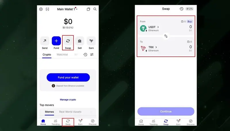 در صفحه اصلی از اپلیکیشن تراست ولت، وارد تب «Swap» شوید. در بخش «From» گزینه USDT و در بخش «To» گزینه TRX را انتخاب کنید. نکته مهم در این مرحله یکسان بودن شبکه‌های انتقال است. مقدار مورد نظر را وارد کرده و روی «Continue» بزنید تا نرخ تبدیل، اسلیپیج و کارمزد تراکنش برای شما نمایش داده‌شود. تراست ولت به‌صورت خودکار بهترین مسیرهای نقدینگی را انتخاب می‌کند.