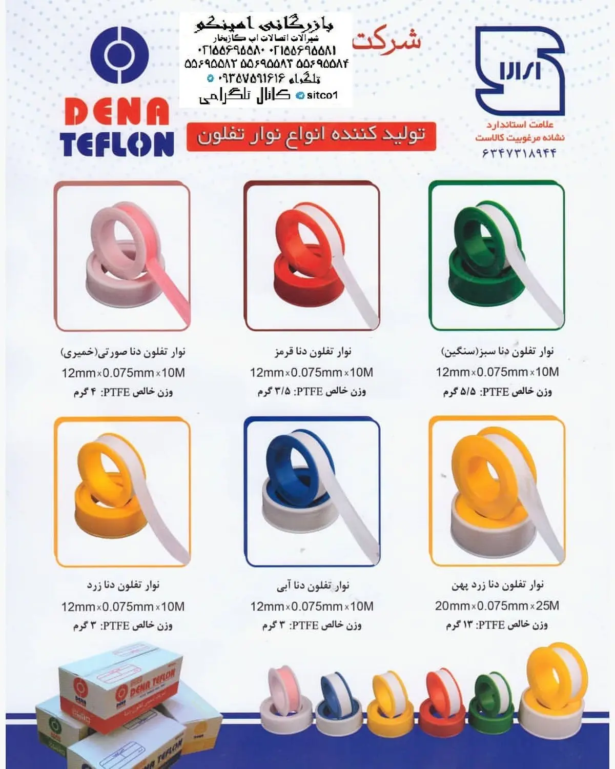 فروش انواع نوارتفلون دنا دررنگ های مختلف برای دریافت لیست قیمت انواع نوارتفلون دنا باماتماس بگیرید 02155695580الی4