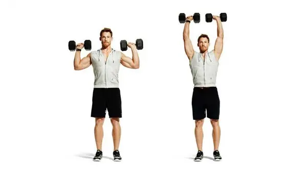 اولین حرکت برنامه بدنسازی مبتدی ماه اول در منزل سرشانه پرس دمبل است. نحوه درست انجام دادن این حرکت بدنسازی این گونه است که ابتدا بایستید و دمبل های خود را در ارتفاع شانه با دستان خود بالا نگه دارید تا بازوها کاملا کشیده شود. سپس به آرامی به موقعیت شروع بازگردید. در موقع انجام این حرکت باد بازو با بدن شما زاویه 90 درجه داشته باشد.