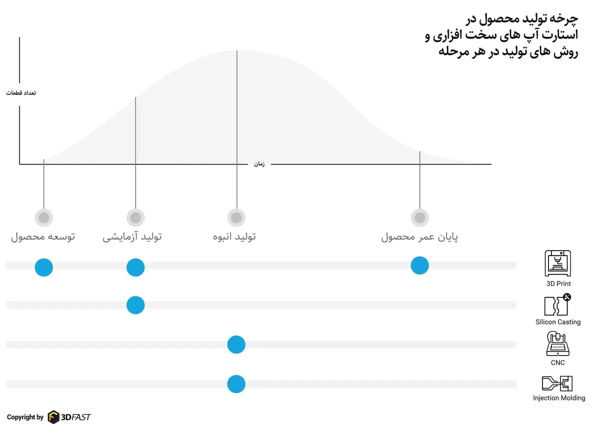 3DFAST نخستین سرویس آنلاین خدمات طراحی، اسکن و پرینت سه بعدی است که با بیش از 36 ماده اولیه از انواع پلیمر تا انواع فلزات و سرامیک را پرینت سه بعدی می کند.3DFAST سعی دارد تا با ایجاد زیرساخت های "industry 4" (انقلاب صنعتی نسل 4) خلا تولید قطعات به روش های سنتی با محدودیت های فراوانش را از میان بردارد، اما انقلاب صنعتی نسل 4 دقیقا چه تاثیری بر نحوه تولید محصولات سخت افزاری دارد؟ برای پاسخ به این موضوع ابتدا به چرخه تولید محصول در استارتاپ های سخت افزاری می پردازیم.