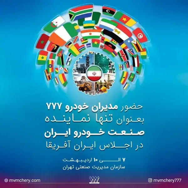 دومین دوره اجلاس بینالمللی ایران و آفریقا از صبح روز 7 اردیبهشت آغاز میشود و مدیران خودرو 777 نیز به عنوان تنها نماینده صنعت خودرو کشور در نمایشگاه جانبی این اجلاس حضور دارد.