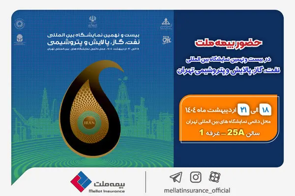 به گزارش روابط عمومی بیمه ملت، بیستونهمین نمایشگاه بینالمللی نفت، گاز، پالایش و پتروشیمی از تاریخ ۱۸ لغایت ۲۱ اردیبهشتماه ۱۴۰۴ از ساعت ۸ لغایت ۱۵ در محل دائمی نمایشگاههای بینالمللی تهران برگزار میشود و غرفه بیمه ملت در سالن ۲۵A میزبان بازدیدکنندگان خواهد بود.