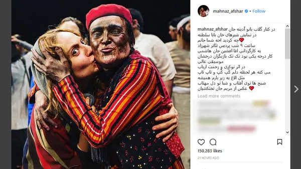 رکنا: مهناز افشار با انتشار عکسی در اینستاگرام در کنار گلاب آدینه، از نمایش شیرهای خان باباسلطنه نوشت.