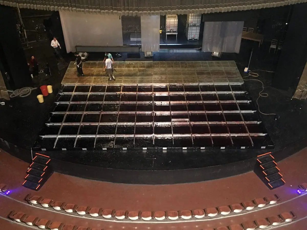 او گفت: گروه صحنه یک سازه آلومینیومی مشبکی را روی سن قرار دادند که ابتدا زیر آن را کاملا واترپروف (عایق در برابر نفوذ آب) کردند و روی آن هم شبکه به نحوی پوشیده شده بود که مایعات روی صحنه داخل شبکه مشبک ریخته شوند و نکته قابل توجه این بود که هر کدام از این فضاهای مربع گونه به دیگری راه داشت تا اگر بازیگری سطل حاوی مایع را در جایی به اشتباه ریخت، هیچ کدام سرریز نشود و بعد از پایان نمایش تمام آنها به یک اندازه پر شده بودند.