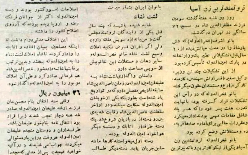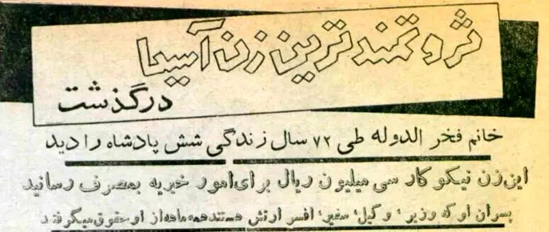 به گزارش رکنا، ۷۰ سال پیش، اشرف الملوک معروف به فخرالدوله، دختر مظفرالدین شاه قاجار درگذشت. او به عنوان یکی از ثروتمندترین زنان آسیا در آن زمان شناخته می شد.