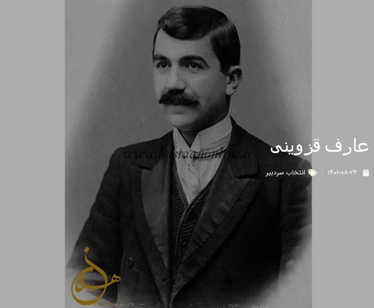 به گزارش خبرنگار تاریخ رکنا، « عارف قزوینی »، « ابوالقاسم قزوینی »متخلص به«عارف» فرزند«هادی» در سال 1300 هجری قمری در قزوین متولد شد و بعد از مدتی به تهران آمد. ورودش مصادف شد با ایحاد مشروطیت و ابراز حرارت ها و احساسات از طرف مردم. او هم وارد این جرگه شد و مشغول ساختن تصنیف گردید. او شاعر ی بود تصنیف ساز، احساساتی و وطنخواه و اکثر اشعاری که سروده، وطنی بوده است. در سال 1333 قمری که در پارک ظل السلطان تهران، گاردن پارتی به نفع شرکت خیریه برای تاسیس مدرسه احمدیه داده می شد، غزلی سرود با این مطلع: