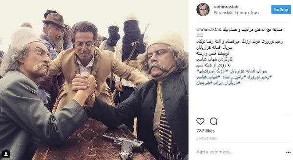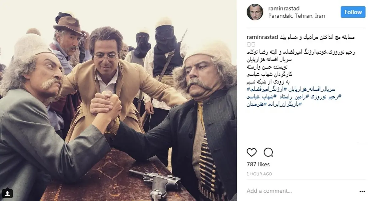 وی با انتشار این عکس از سریال افسانه هزارپایان منتشر کرد و نوشت: «مسابقه مچ انداختن مرادبیک و حسام بیک؛ رحیم نوروزى، خودم، ارژنگ امیرفضلى و البته رضا توکلى. سریال افسانه هزارپایان، نویسنده حسن وارسته، کارگردان شهاب عباسى، به زودى از شبکه نسیم پخش می شود.»برای ورود به کانال تلگرام ما کلیک کنید.