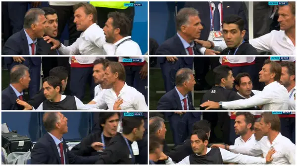 به نوشته این سایت و طبق فیلمی که منتشر شده است کارلوس کی روش وقتی در دقیقه 65 بازی اعتراض شدید دستیار رنار به داور بازی برای دادن اخطار به بازیکن ایران را دید طاقت نیاورد و به شدت نسبت به دخالت های مربی مراکش اعتراض کرد که همین موضوع به درگیری شدید نیمکت نشینان دو تیم تبدیل شد آن هم مقابل دیدگان رنار که سعی در آرام کردن هر دو طرف داشت.