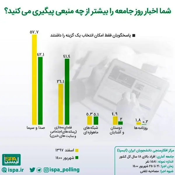 این نظرسنجی، شهریور امسال، در یک جمعیت آماری که ۱۵۸۱ نفر بوده و همگی بالای ۱۸ سال داشتهاند، به صورت تلفنی انجام شده و نتیجه آن با نظرسنجی مشابه در اسفند ۱۳۹۷، مقایسه شده است.